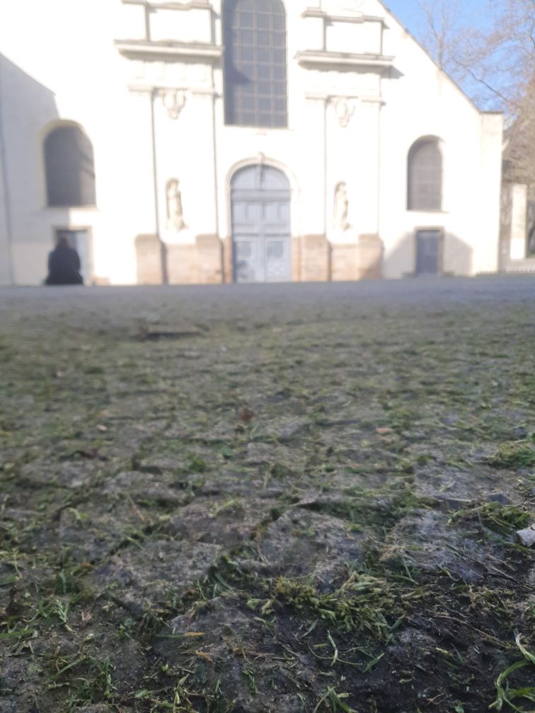 Des pavés désherbés en février 2026 à l'aide d'une brosse métallique, avant aspiration