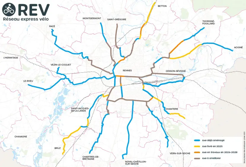 Rennes a commencé son réseau express vélo avec un accent mis sur les liaisons couronne - Rennes, mais le réseau est presque absent dans commune de Rennes (intra-rocade). Les lignes de trambus prévues ajouteront des km de voie cyclable propre, mais après 2030 et en étoile depuis le centre, République.