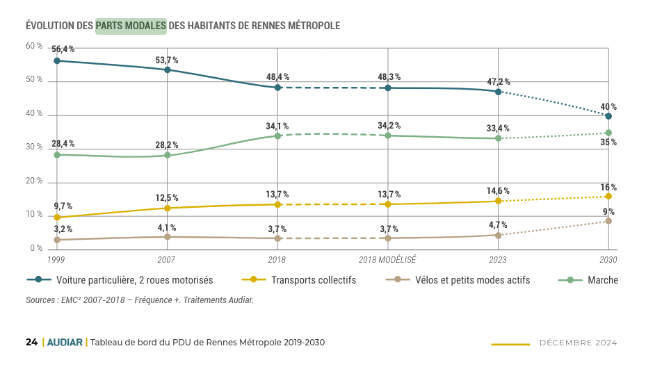 Rennes reste une métropole et une ville avant tout automobiliste : sa part modale, de 47 % dans la métropole et de 31 % pour la ville-coeur, n'a baissé que d'1% entre 2018 et 2023 !