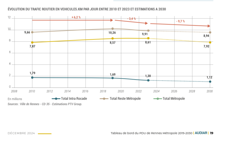 Ainsi, si la ligne B du métro, l'essor du réseau Star (+17 % de fréquentation et +16 % d'offre depuis 2019) ainsi que l'essor du vélo via la naissance d'infrastructures sécurisées sont des succès notables, le défi reste conséquent... et toujours plus urgent : l'empreinte climat de la route à Rennes a augmenté de 6 % depuis 2010.