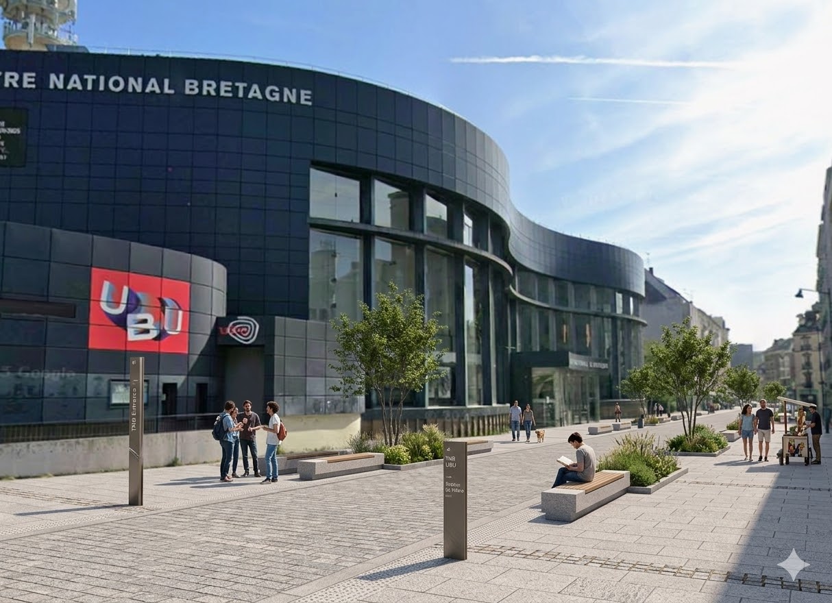 Dans la continuité de la place Toussaint, 200 m à l'est de Rennes, une nouvelle place piétonne sera créée devant le Théâtre National de Bretagne, un monumement important de la culture rennaise
